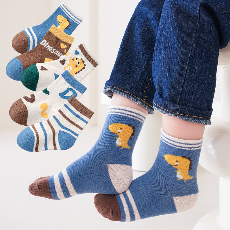 Keep your little ones cozy and stylish with this set of 5 high-quality cotton socks featuring fun dinosaur and SpiderM cartoon designs.