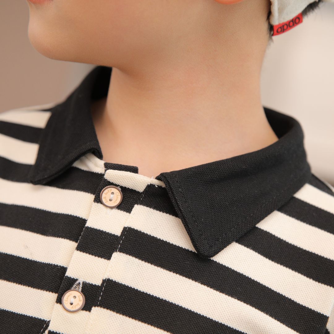 This black and white and green and white striped cotton polo shirt is perfect for boys aged 1 to 10 years.
